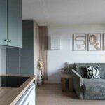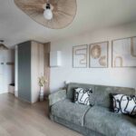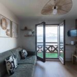Le coin salon est baigné de lumière grâce à la grande baie vitrée, celle-ci donne accès au balcon où vous trouverez une table et ses deux chaises pour y partager un verre, prendre l’apéritif ou y manger.